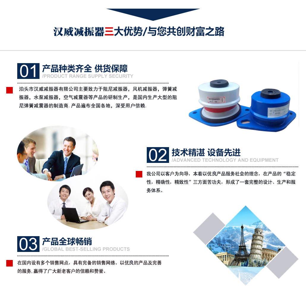?泊頭市漢威減振器有限公司主要致力于阻尼減振器,風(fēng)機(jī)減振器,彈簧減振器,水泵減振器,空氣減震器等產(chǎn)品的研制生產(chǎn),是國內(nèi)生產(chǎn)阻尼彈簧減震器的制造商,產(chǎn)品廣泛用于中央空調(diào)、通風(fēng)管道、鋼鐵、發(fā)電、石化、水泥和城市供熱等行業(yè)的各類管道和設(shè)備上,并在全國多地工程上得到應(yīng)用,業(yè)績遍布全國多地,深受用戶信賴. 公司主要減振器系列產(chǎn)品有:中央空調(diào)系列減振器、泵房系列減振器、管道系列減振器、風(fēng)機(jī)系列減振器、以及自行設(shè)計(jì)制作的系列隔振臺(tái)座。泊頭市漢威減震器科技有限公司擁有多名高素質(zhì)技術(shù)人員,擁有完善的阻尼彈簧減震器生產(chǎn)和檢驗(yàn)專用設(shè)備,擁有硅橡膠自動(dòng)擠出生產(chǎn)線,全自動(dòng)彈簧機(jī)等設(shè)備。生產(chǎn)條件逐漸完善進(jìn)步,努力擴(kuò)大生產(chǎn)規(guī)模,提高泊頭市減震器科技有限公司的生產(chǎn)競爭力。 多年來漢威減振器以三誠作為公司的字號(hào),旨在立足當(dāng)前......